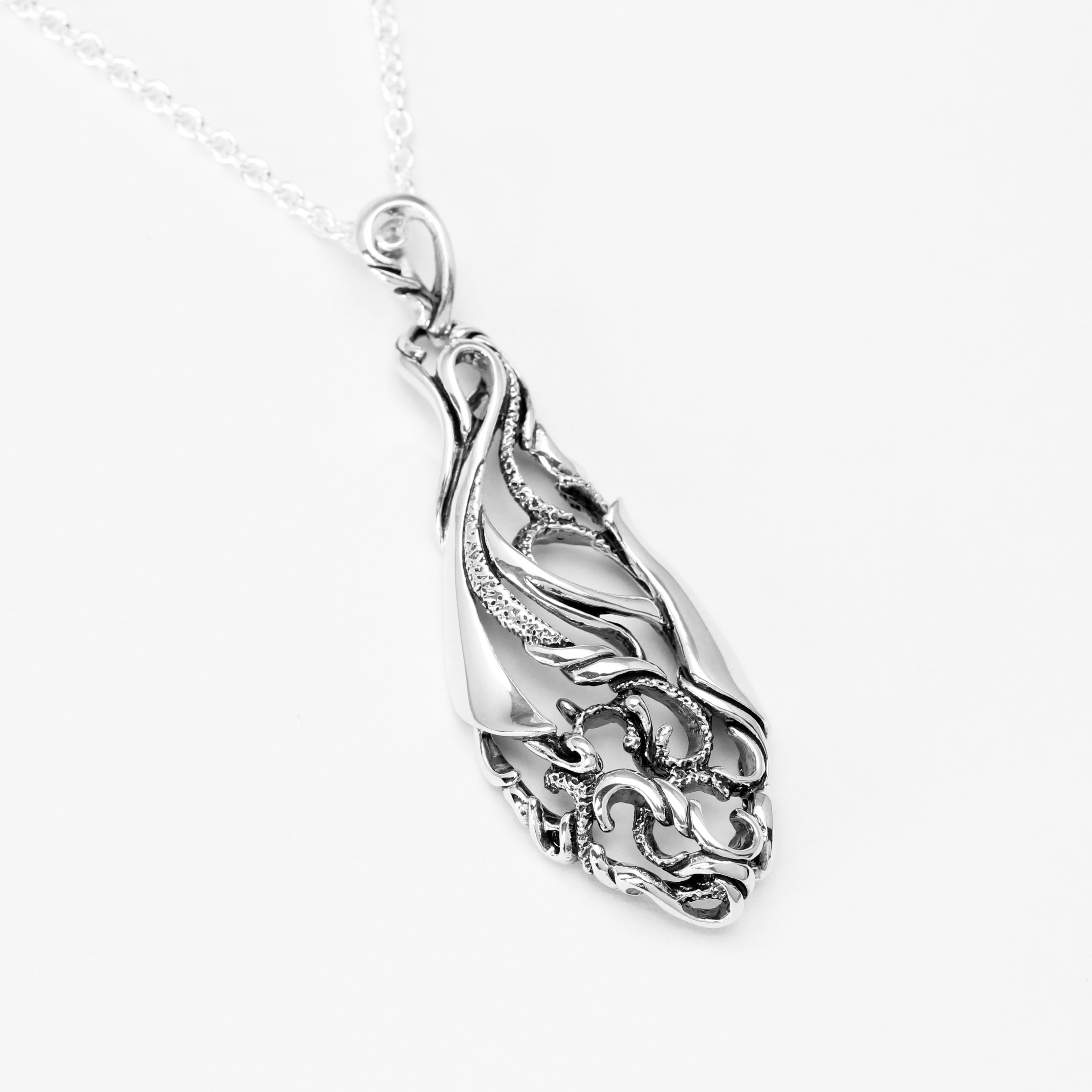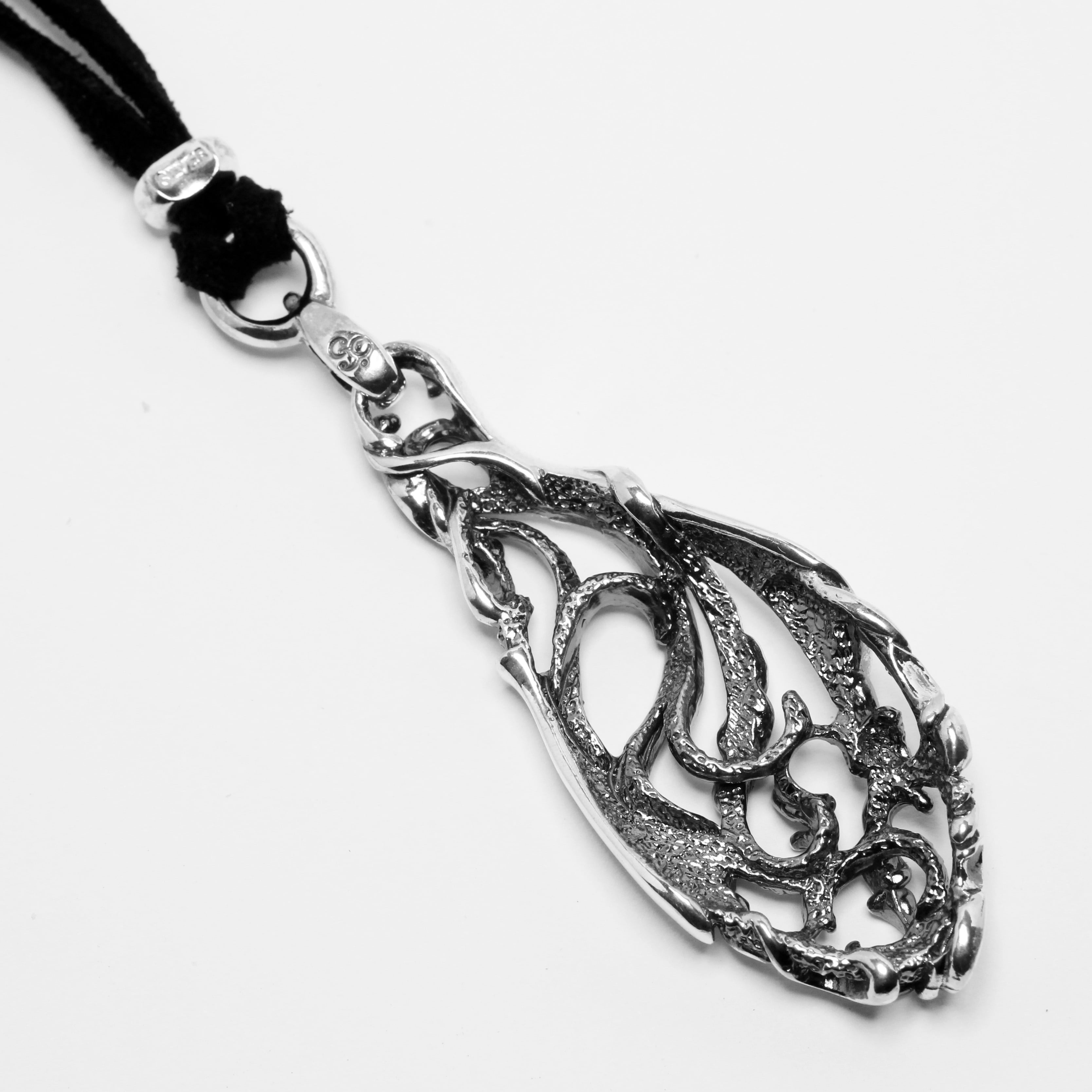 流れ落ちるように伸びた曲線と不規則動きの中でまとまりのあるシルエットに仕上がったペンダントトップ。