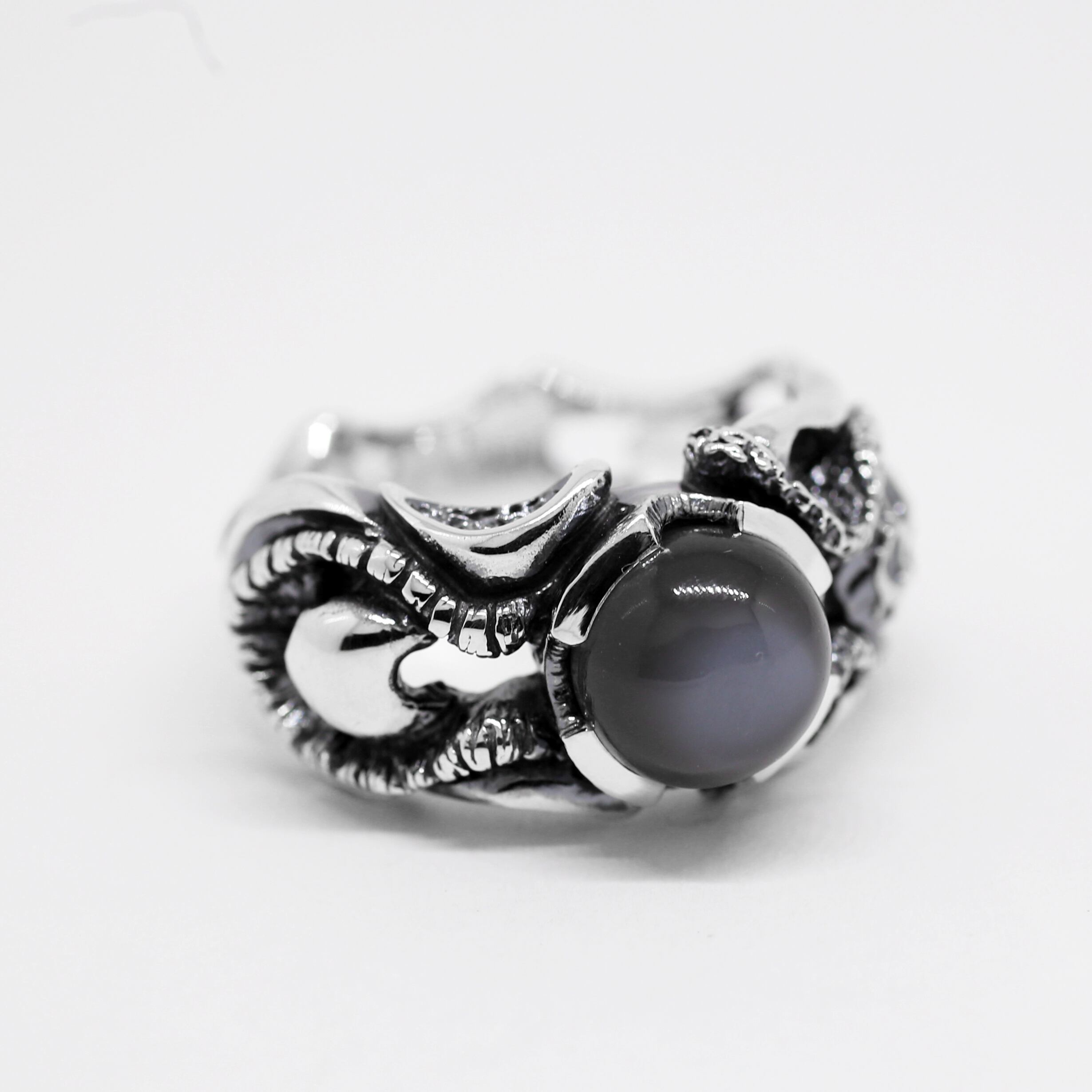 着けやすいシルエットの中にも動きのあるデザインが施され、中央にセッティングされた天然石が映える逸品。