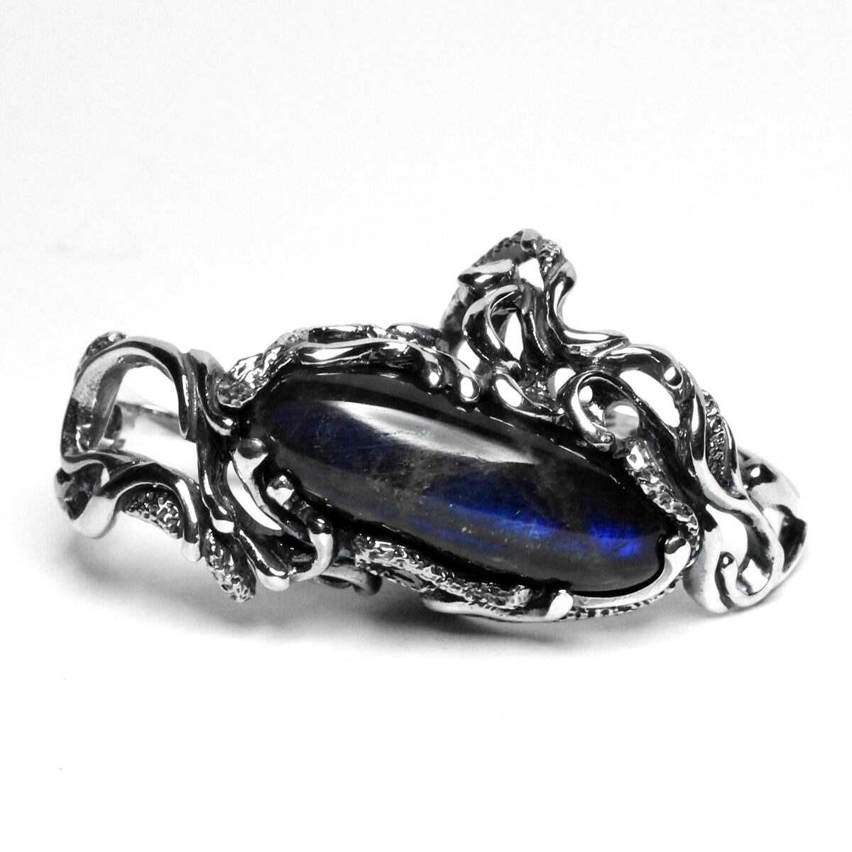 横長シルエットの天然石を大胆に配置した二本差しリング。それぞれの指をめぐるようなラインワークが魅せる逸品。