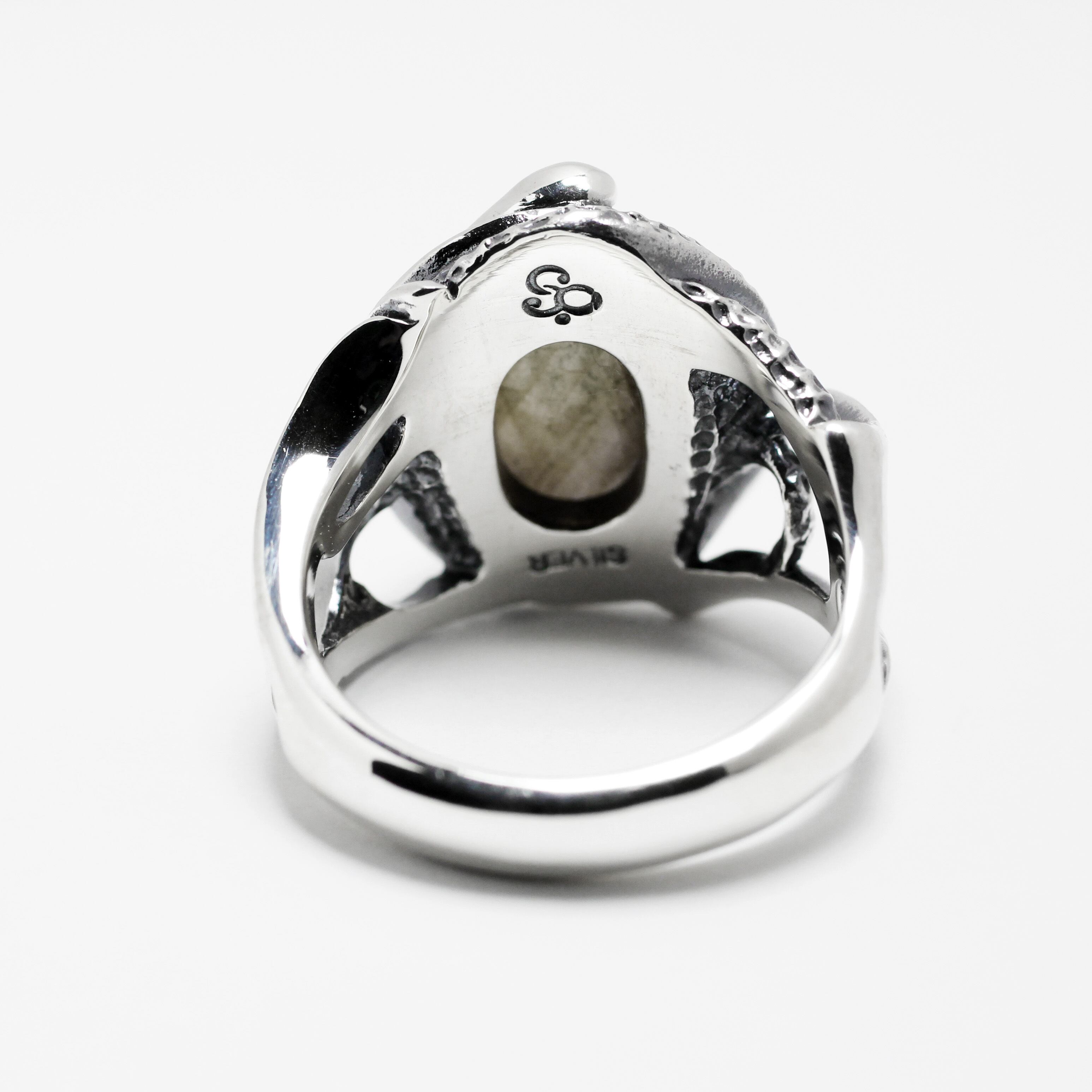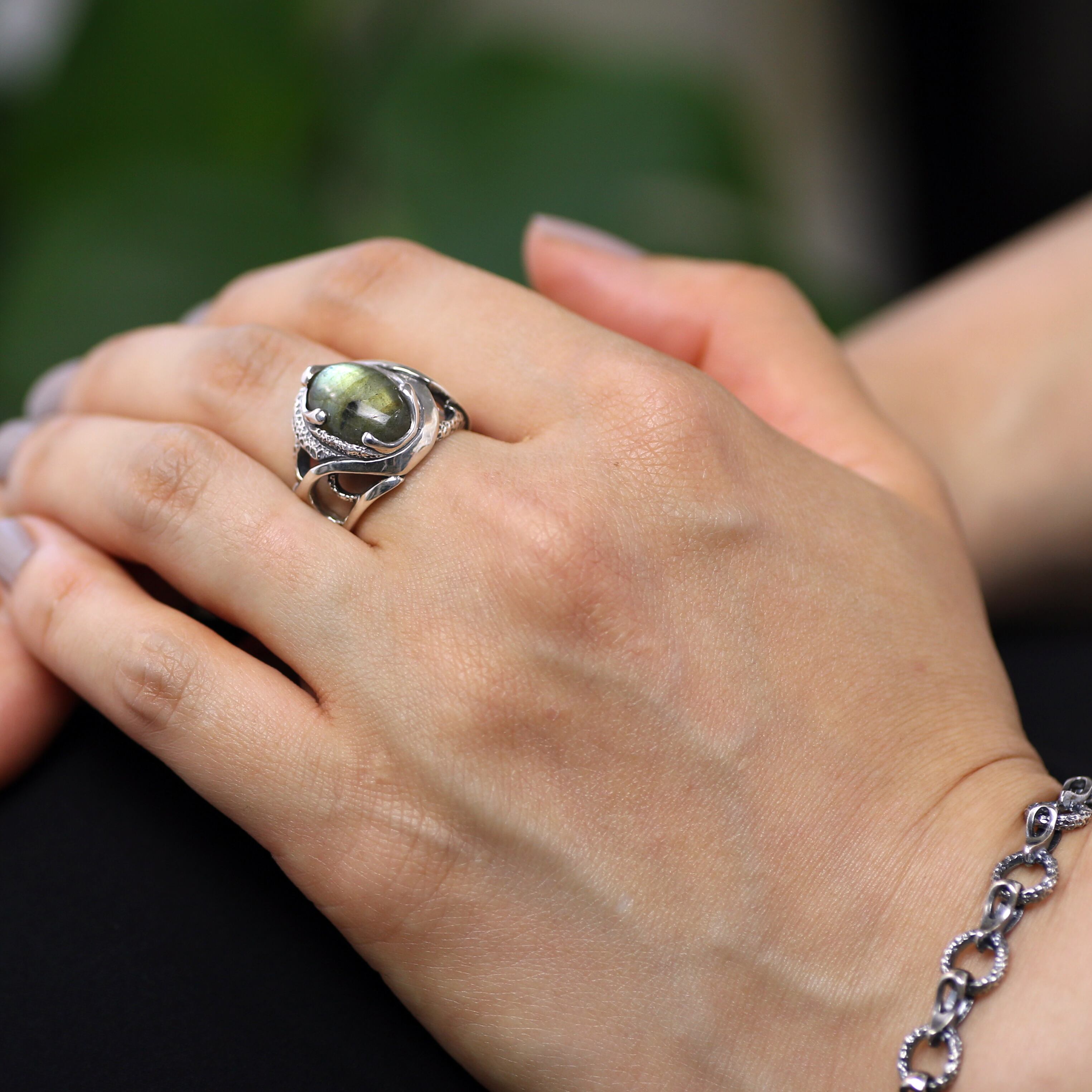 優雅なラインワークで自然な流れの中にラブラドライトを溶け込むようにセッティングされた潤い感漂うバランスも良いリング。